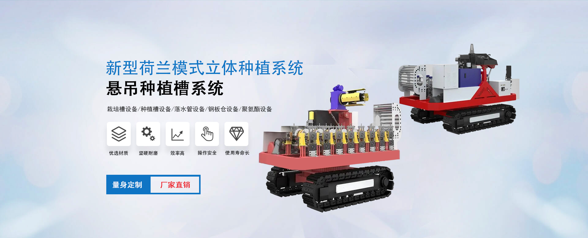 雄博機(jī)械主營:種植槽設(shè)備/栽培槽設(shè)備/草莓栽培槽/新型立體種植槽/草莓無土栽培設(shè)備/草莓立體種植系統(tǒng)/懸吊種植槽系統(tǒng)/落水管設(shè)備/鋼板倉設(shè)備/聚氨酯設(shè)備等。
